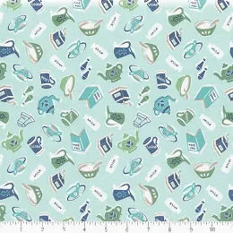 Songbird is a light mint teal green there are teapots, cups and saucers, Sugar, Coffee grinder, and other kitchen wares.